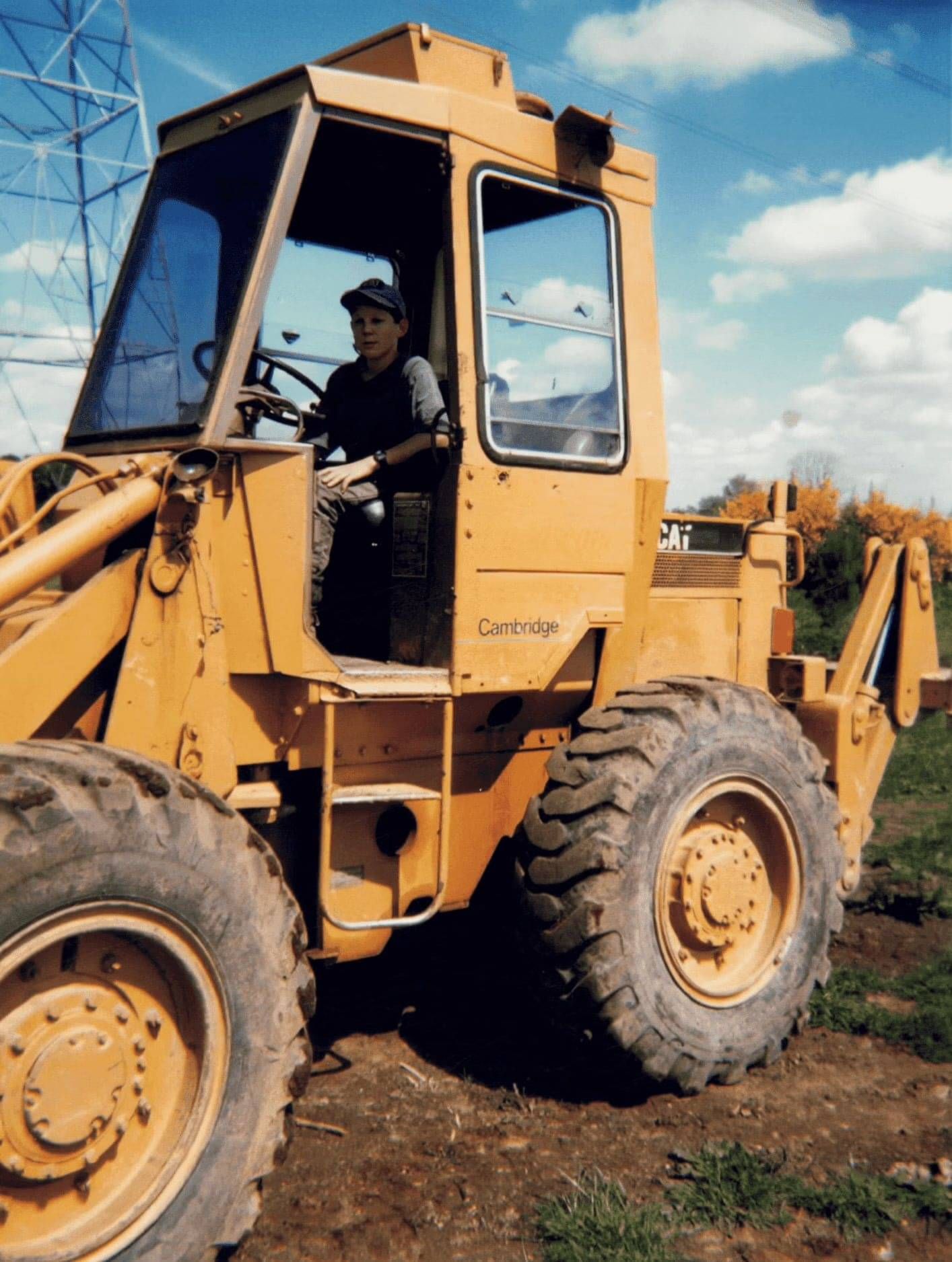 Operating a Cat 910 Loader and loading topsoil onto an International truck, carting it to the homebuilt screener that was made from a pea harvester cylinder wrapped in bird netting driven by the power take-off from a David Brown tractor was a huge step forward from what he had been used to.